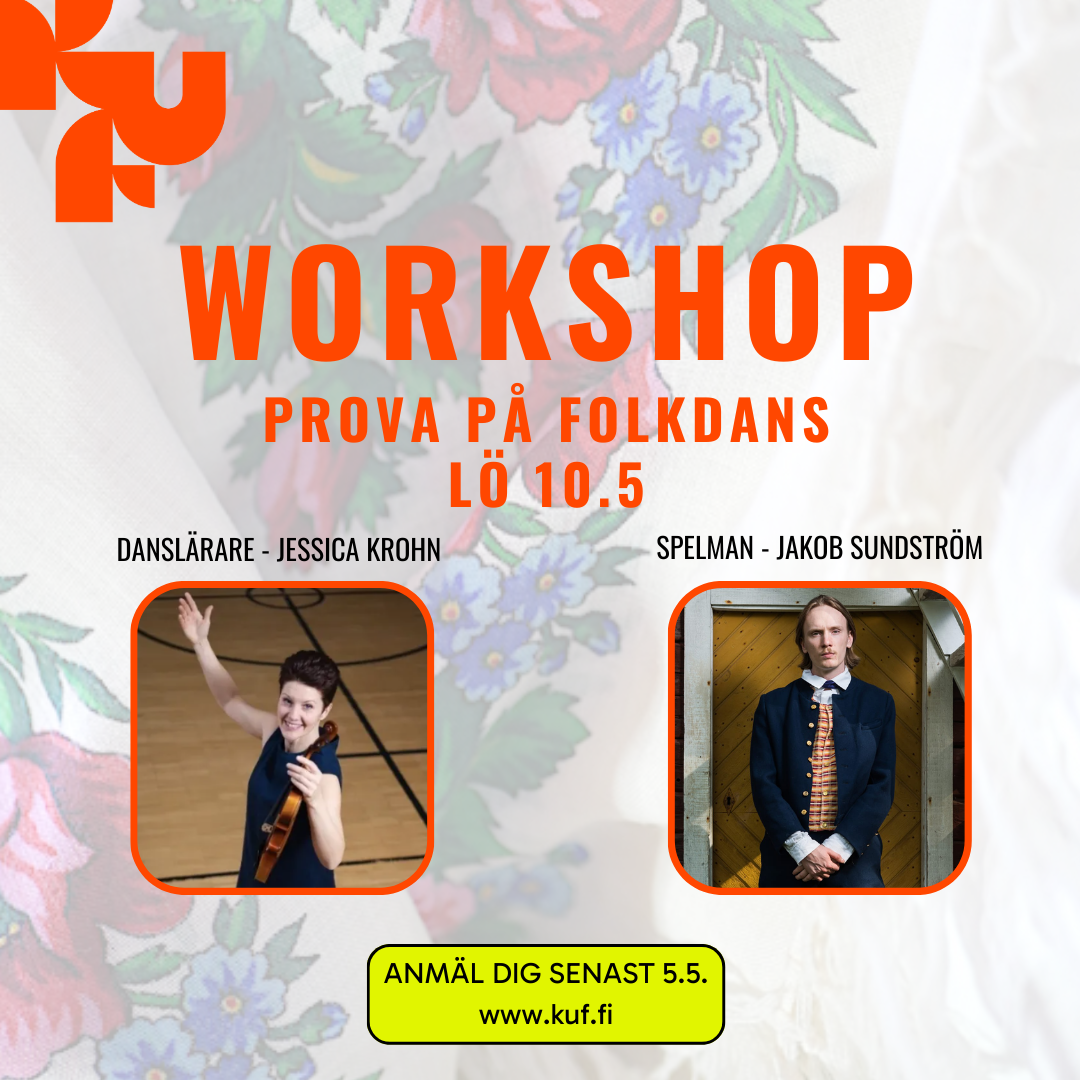 Karleby Ungdomsförening arrangerar en workshop i folkdans för de som är intresserade och vill prova på att dansa folkdans! Workshopen hålls vid Jungsborg lördagen 10.5 kl.11-14 inklusive en lunchpaus (egen lunch med). Danslärare för workshopen är Jessica Krohn och spelman är Jacob Sundström. Ingen åldersdiskriminering - ung som gammal är välkommen att delta.