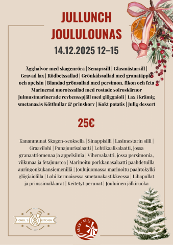 I restaurangen serveras jullunch (kl 12-15) och kaféet är öppet. Jullunchen serveras av Oneils Kitchen. Pris: 25€. Ingen förhandsbokning.